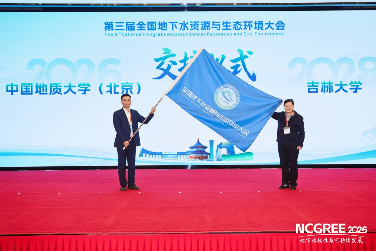 会议闭幕式上举行了隆重的会旗交接仪式。本届会议承办方中国地质大学(北京)水资源与环境学院郭华明院长将会议旗帜郑重递交给吉林大学新能源与环境学院董双石院长,正式宣布吉林大学获得第三届全国地下水资源与生态环境大会的主办权。下一届会议预计于2028年4月在长春举行,届时将设置更多专题论坛及产学研对接环节,进一步推动我国地下水资源的科学保护与生态环境的协同发展。